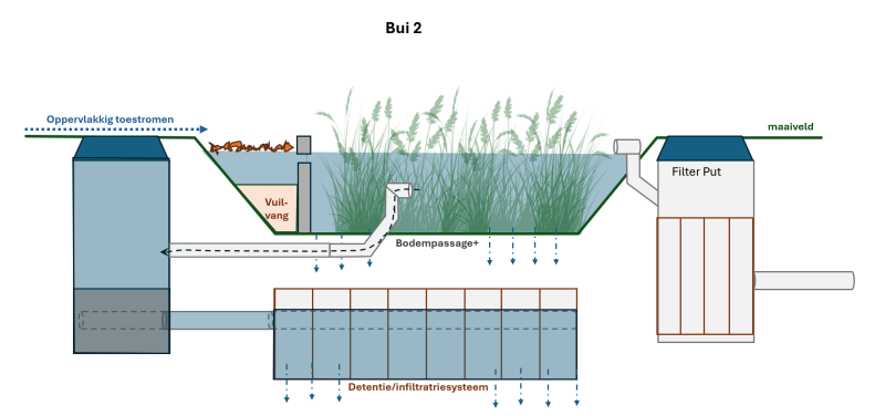 Het overschot aan regenwater van extreme piekbuien (na bodemverzadigingen en het vullen van de ondergrondse retentie/infiltratievoorziening) wordt door een (lamellen)filter gehaald om de kwaliteit van het hemelwater te verbeteren, waarna het in de hemelwaterafvoer of op open water terecht komt.
