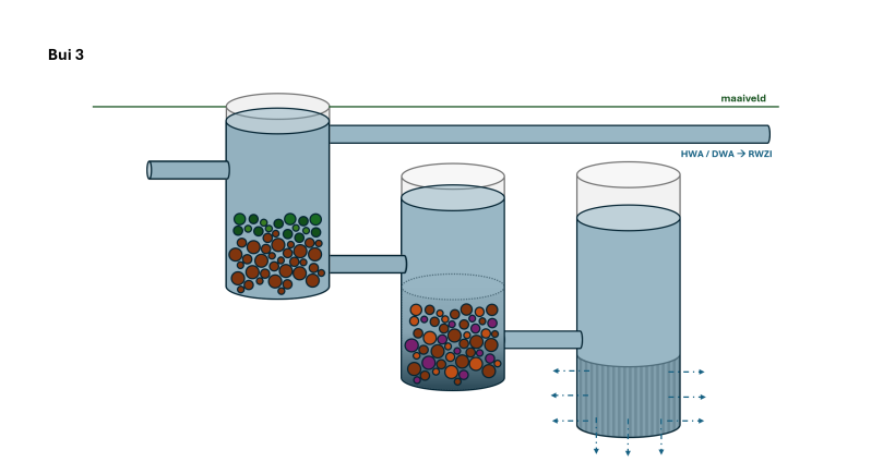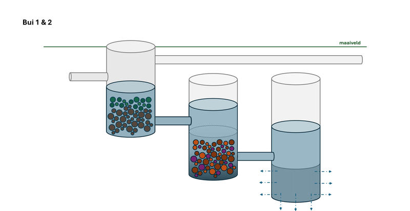 Drie systemen aan elkaar is best high-end. Het zou ook een put met twee compartimenten kunnen zijn. De kolk staat overigens niet ingetekend, maar moet er wel bij bedacht worden.