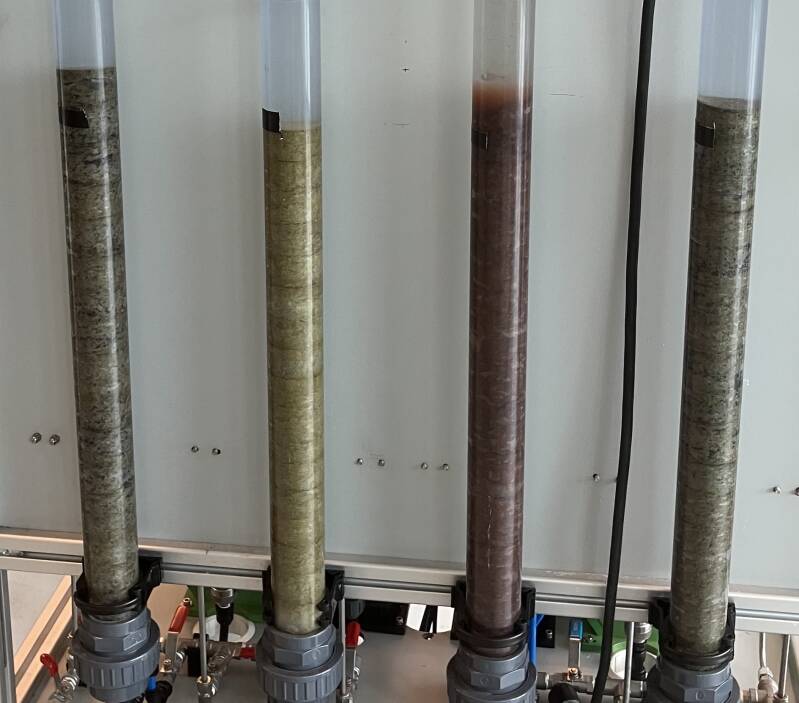 In de afgelopen maand zijn bij KWR de eerste praktische proeven uitgevoerd om de potentie van steenwol met ijzeroxide en/of actief kool als filtermedium te testen. Deze proeven zijn uitgevoerd op de werkplaats van KWR in Nieuwegein. Daar is een kolomopstelling gebouwd om de filtratiecapaciteit van vier verschillende varianten van steenwol te testen: (1) steenwol op zichzelf, (2) steenwol met actief kool korrels, (3) steenwol met ijzeroxide poeder en (4) steenwol met actief kool en ijzeroxide korrels.